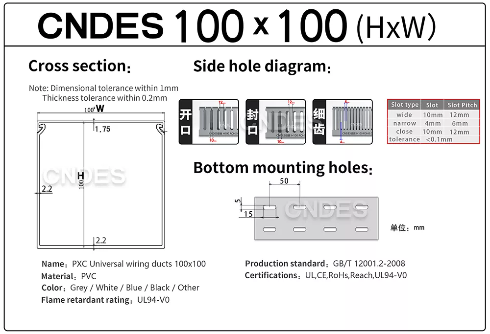 Optimera dina kabelprojekt med våra skräddarsydda 100×100 trådledningsledningar. Som en ledande tillverkare och leverantör av PVC-kabelbrickor i Kina tillhandahåller CNDES pålitliga, högprecisions- och anpassningsbara lösningar för alla dina kabelhanteringsbehov. Vi har alla specifikationer av trådkanaler (kabelrännor). Om du behöver andra specifikationer är du välkommen att kontakta oss!