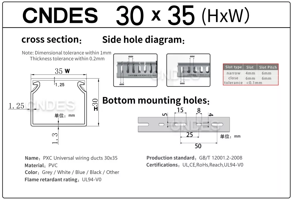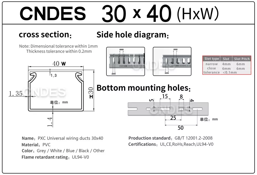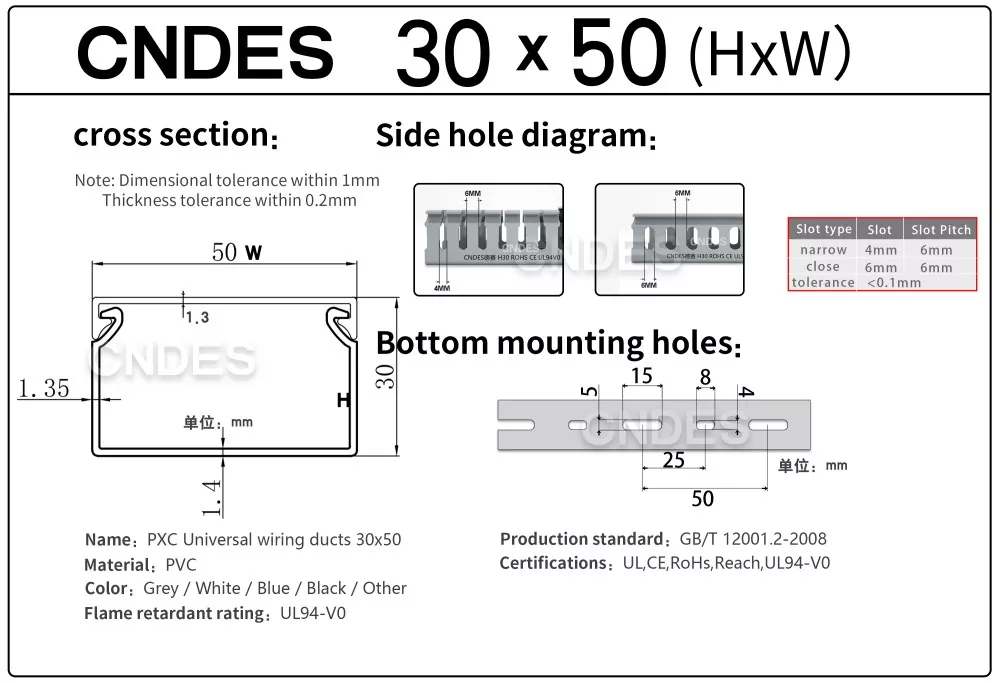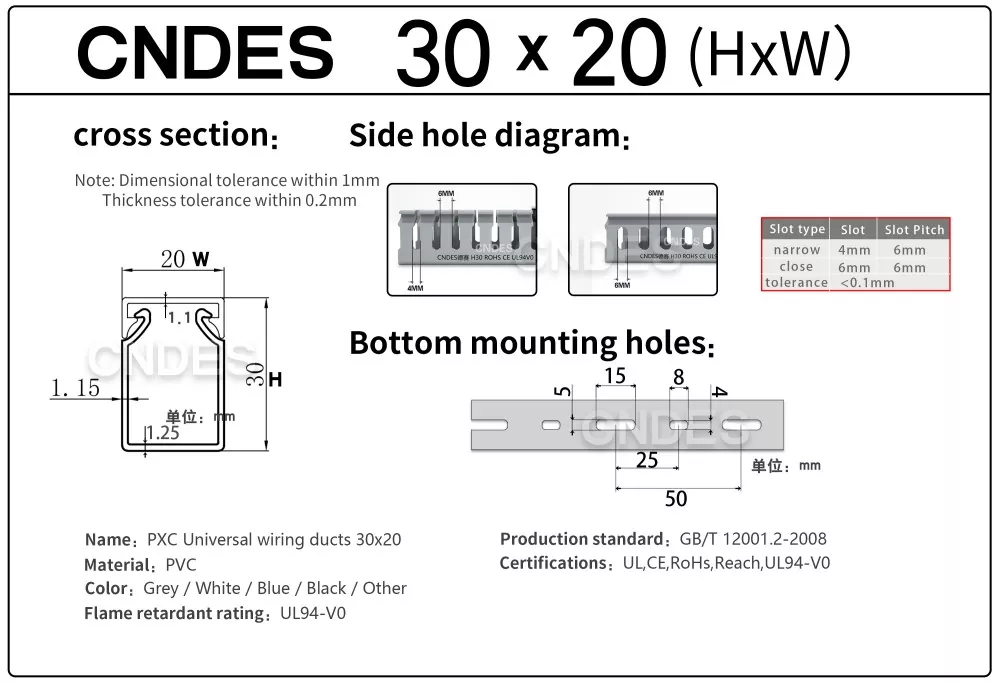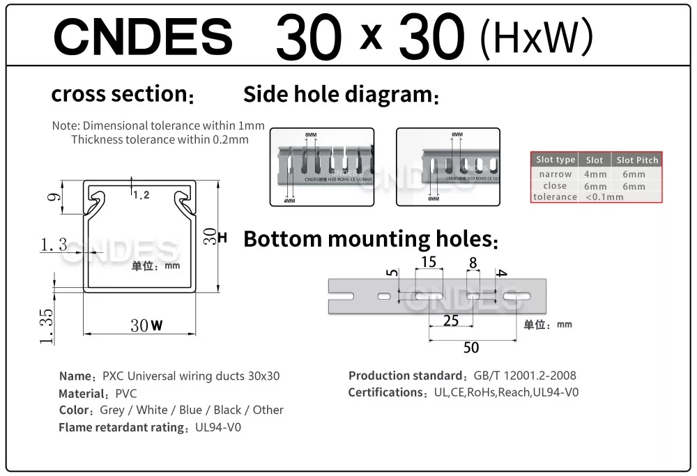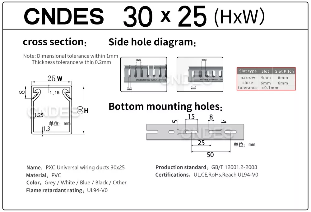 Den innehåller information som tjocklek, dimensioner och borrning av vår kvalitetsledning för 30 mm höjd slitsad PVC-kabelhantering.