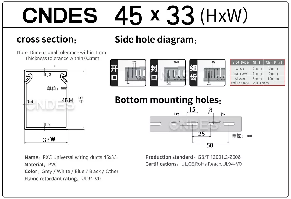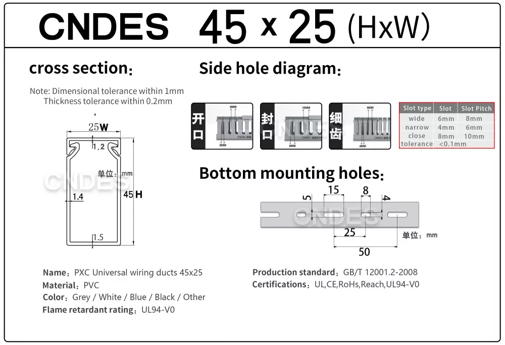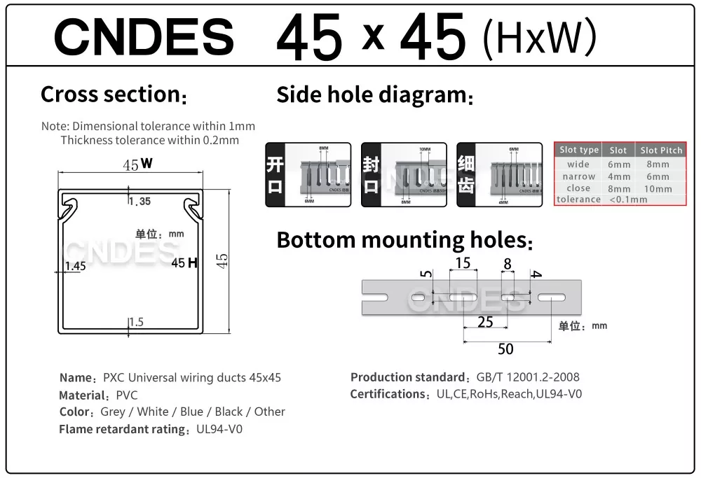 Som den professionella tillverkaren vill vi ge dig 45 mm hög CNDES slitsad PVC-trådskyddskanal. Inklusive 45*25, 45*33, 45*45.