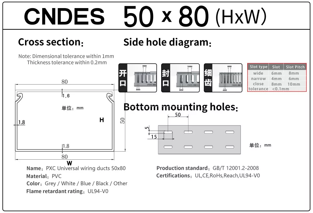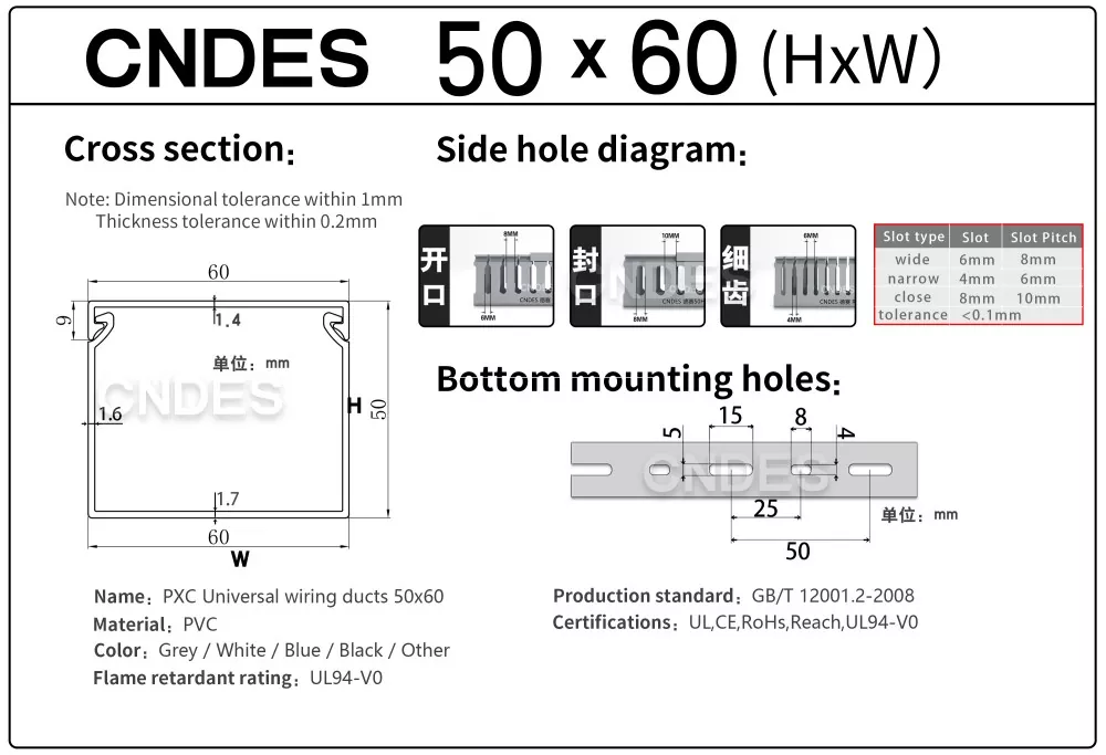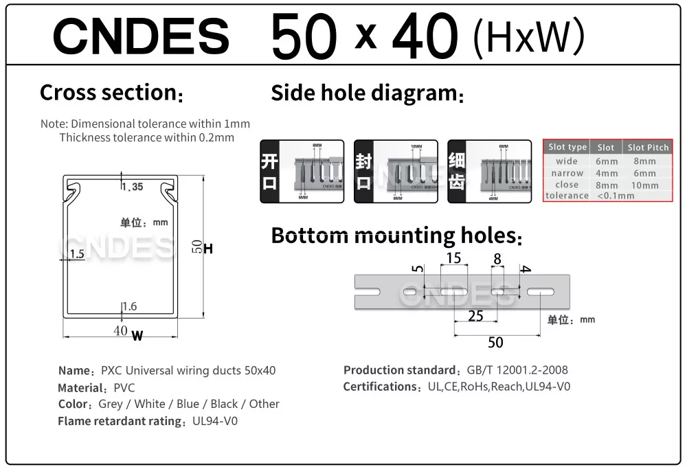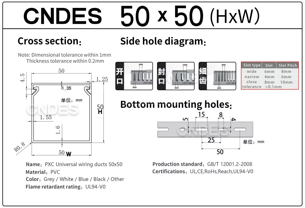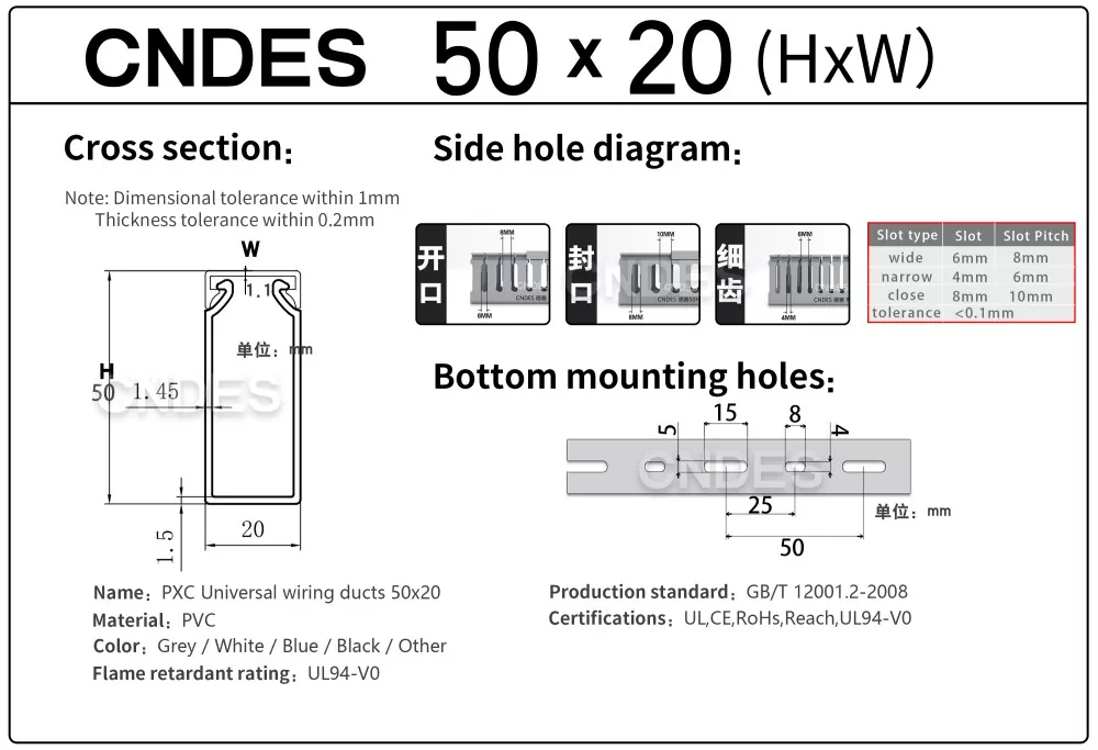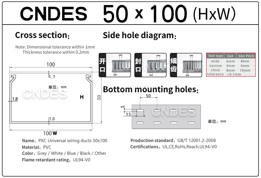 CNDES är en tillverkare och leverantör som specialiserat sig på att leverera slitsad PVC-panelledningskanal. Här kommer vi att presentera vår 50 mm höga kabelkanal, inklusive följande specifikationer: 50*20,50*25,50*30,50*35,50*40,50*45,50*50,50*55,50*60,50*80,50*100.